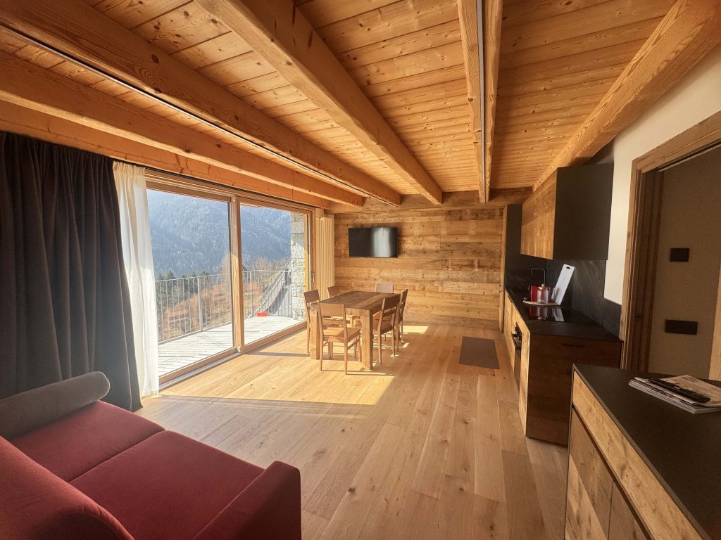 Le finestre, i balconi fioriti e la vista panoramica sulle montagne invitano gli ospiti a entrare in un ambiente caldo e familiare, grazie alla presenza di due sale panoramiche e camere arredate in stile montano.